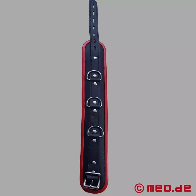 Maksimaalne funktsionaalsus kombineerituna klassikaliselt kauni disainiga! Tulemus: väljendusrikas värvides BDSM-kaelarihm, mis mitte ainult ei näe hea välja ja mida on väga mugav kanda, vaid avaldab muljet ka oma taskukohase hinnaga. Must/punane BDSM-kaelarihm on varustatud rõngastega, mille külge saab kinnitada rihma või ketid.