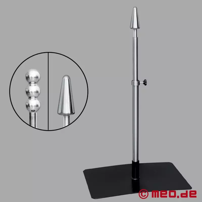 Mit dem Dildo-Pranger von MEO bringen Sie Ihre Lieblings-Fantasien in die Realität und setzen dominante BDSM-Szenarien um. Ein stabiler Standfuß sorgt für einen festen Halt der Dildo-Stange. Fixieren Sie Ihren Partner in stehender Position. Ziehen Sie die Teleskopstange anschließend so weit aus, bis der ausgewählte Dildo oder Plug komplett eingeführt ist. Ihr Partner wird dadurch gezwungen die Stellung zu halten, während Sie den Anblick ganz in Ruhe genießen. Die Dildostange wird zusammen mit zwei unterschiedlichen Aufsätzen geliefert! Der klassische Plug sorgt für ein ausfüllendes Vergnügen. Dank der konischen Form dringt der Plug sanft aber bestimmt ein. Der glänzend polierte Dildo stimuliert mit drei dicken Kugeln intensiv alle vaginalen und analen Hotspots. Standplatte und Stange bestehen aus pulverbeschichtetem Metall, die Dildos sind aus Aluminium gefertigt. Alle Komponenten lassen sich einfach zusammenbauen und nach der Verwendung wieder auseinandernehmen, um die Dildo-Stange platzsparend zu verstauen.