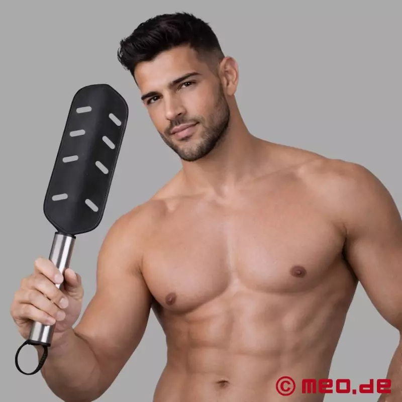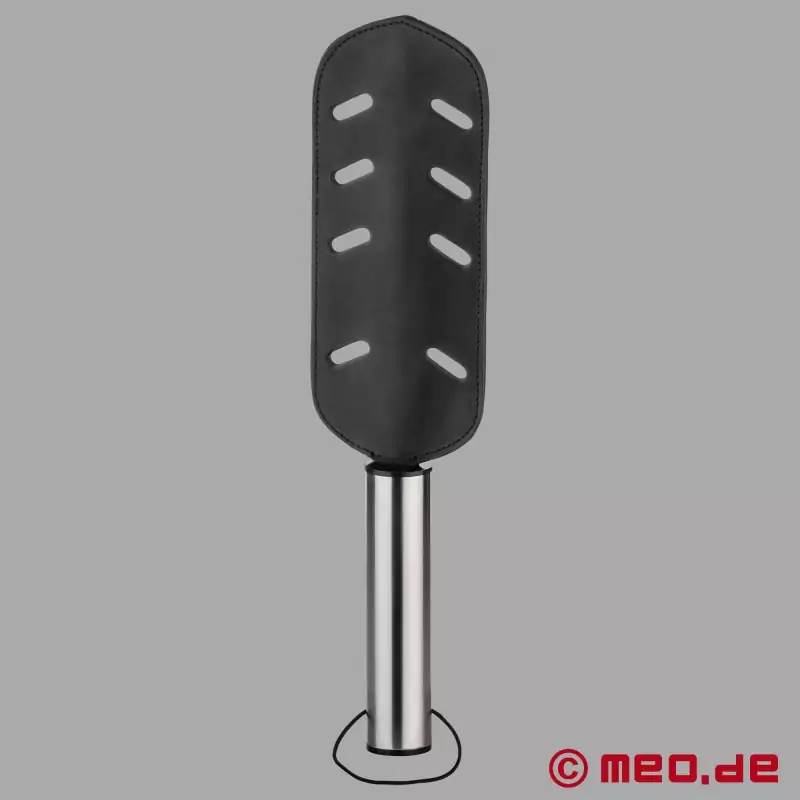See luksuslik BDSM-paddle sarjast HurtMe™ firmalt MEO® Germany ühendab endas roostevabast terasest käepideme ja suure sadulanahast löögipinna. Kahest õmmeldud nahakihist tugevdatud konstruktsioon on mõõtmete poolest stabiilne, korralikult viimistletud ja võimaldab BDSM-seanssi ajal täpset kontrolli - alates selgetest signaalidest kuni intensiivsema stimulatsioonini.