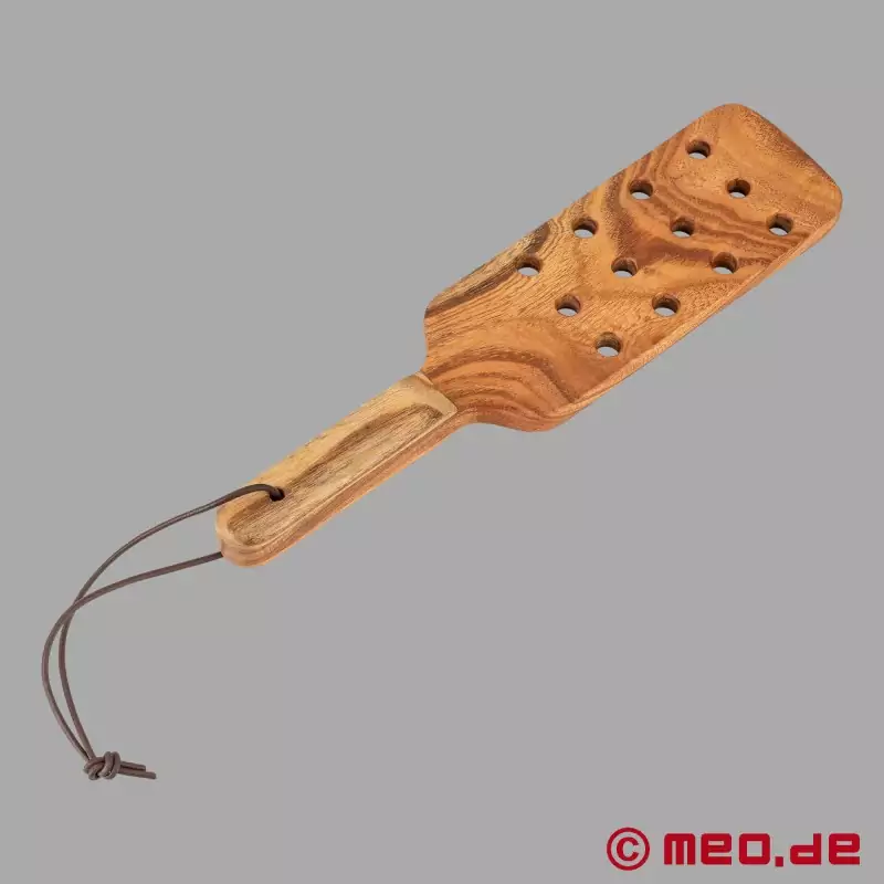Meie klassikaline puidust peksumispadul sobib nii edasijõudnutele kui ka algajatele. Kõik servad on ümardatud, mis vähendab vigastuste ohtu. Tänu ergonoomiliselt kujundatud käepidemele istub paddle mugavalt käes ja tagab turvalise ja täpse peksmise. Our paddle has holes and seetõttu saavutab see suurema löögiefekti kui ilma aukudeta paddle. Augud vähendavad õhupatja, mis moodustub löögi korral paddle ja nahapinna vahele, suurendades seeläbi löögi intensiivsust.