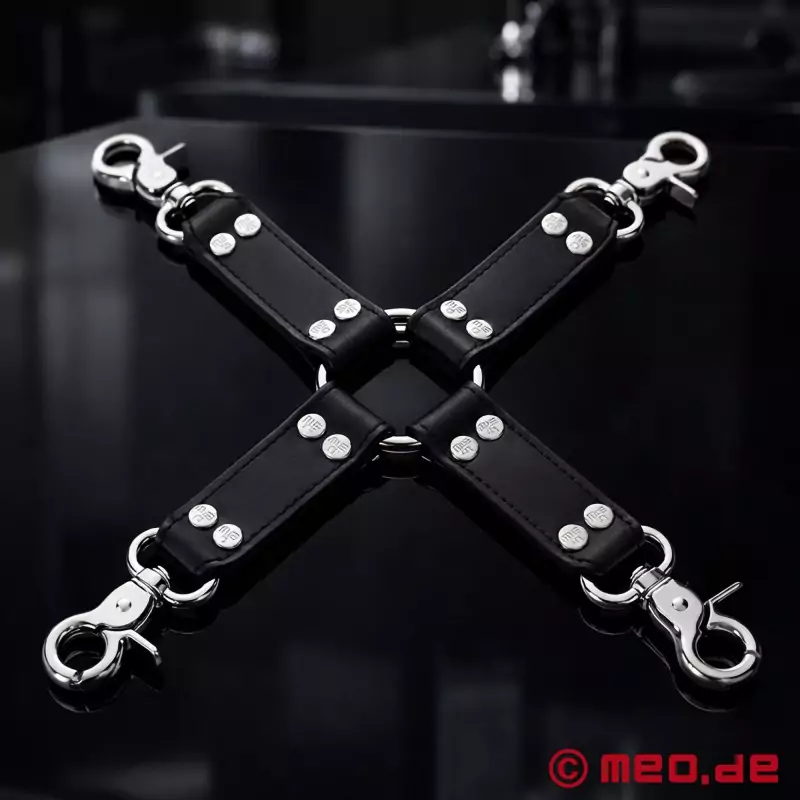 Meie ristikujulist ühendajat, millel on 4 haakekonksu, kasutatakse tavaliselt käeraudade ja jalaraudade ühendamiseks ning mitmesuguste sidumisasendite võimaldamiseks. Ühendaja koosneb neljast ristikujulisest nahkrihmast, mille mõlemas otsas on neli kinnituskonksu. Käerauad ja jalaraudad saab kinnitada iga haakekonksu külge, et võimaldada erinevaid asendeid, nagu näiteks straddle asend või Hogtie asend. Selline piiraja võimaldab piirata tugevalt kinnipeetava liikumisvabadust ja kogeda erinevaid erootilisi stsenaariume.