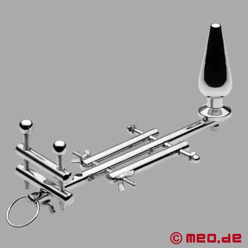 Mittels dieser schweren Vorrichtung lassen sich nicht nur die Hoden „behandeln“, sondern auch gleichzeitig die Eichel oder der Penis-Schaft. Dieses Gerät ist nicht nur flexibel einzustellen, sondern verfügt zudem über einen Buttplug. Als I-Tüpfelchen wurde diese Apparatur noch mit einem O-Ring ausgestattet, an dem eine Führungsleine angebracht werden kann.