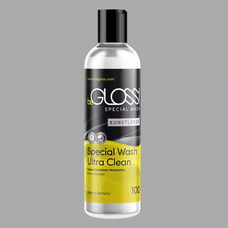 beGLOSS® Special Wash™ on vegan puhastusvahend kunstnahast valmistatud toodete jaoks. See eemaldab mustuse ja ebameeldivad lõhnad õrnalt, kiiresti ja tõhusalt, toetab kunstnahast valmistatud rõivaste ja BDSM aksessuaaride hooldust, aitab säilitada materjali paindlikkust ja võib kaitsta materjali pragunemise eest. Valmistatud Saksamaal.