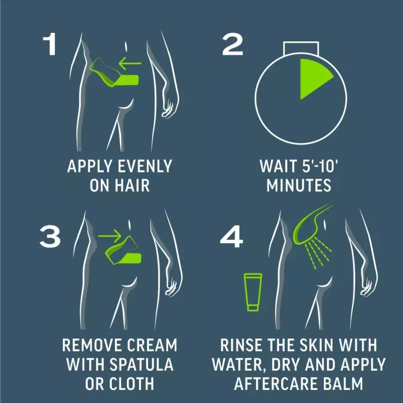 Enne kasutamist lugege ja järgige kõiki olulisi juhiseid. Kandke kreemi ühtlaselt nii, et karvad oleksid täielikult kaetud. Mõju algab 5 minuti pärast. Pärast 5 minutit testige väikest piirkonda, et näha, kas karvad on juba eemaldatavad. Vajadusel jätke kreem veel mõneks minutiks, kuid mitte kauemaks kui kokku 10 minutiks. Seejärel eemaldage kreem spaatliga ja loputage nahk põhjalikult veega. Lõpuks kandke nahale niisutav palsam, mis toidab ja rahustab nahka.