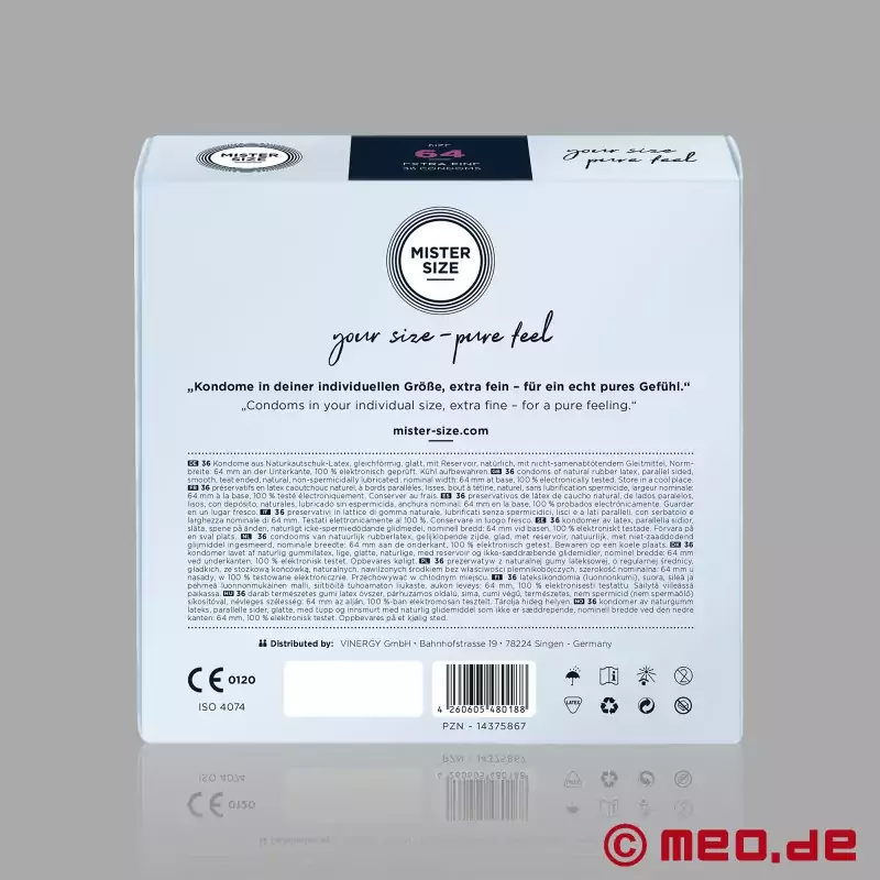 MISTER SIZE™ kondoomid pakuvad mugavat tunnetust ja usaldusväärset kaitset samaaegselt. Nad vastavad ISO 4074 standardile, on dermatoloogiliselt testitud ja 100% elektrooniliselt testitud kvaliteedikontrolli osana.