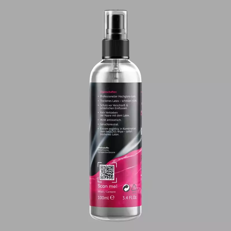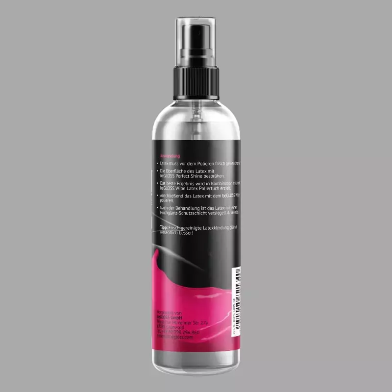 beGLOSS® Perfect Shine™ on kõrgekvaliteediline poleerimisvahend käepärases pump-pihustusformaadis, mis sobib ideaalselt lateksrõivaste ja -maskide jaoks. Toode loob professionaalse, keerulise kõrgläike ja võimaldab kuiva viimistlust. Koos beGLOSS® Wipe™ latex poleerimislappidega avab premium-sprei oma täieliku efekti. beGLOSS® Perfect Shine™ on väga ökonoomne ja aitab vältida karvade kleepumist (ka lateksmaskidel). Valmistatud Saksamaal.