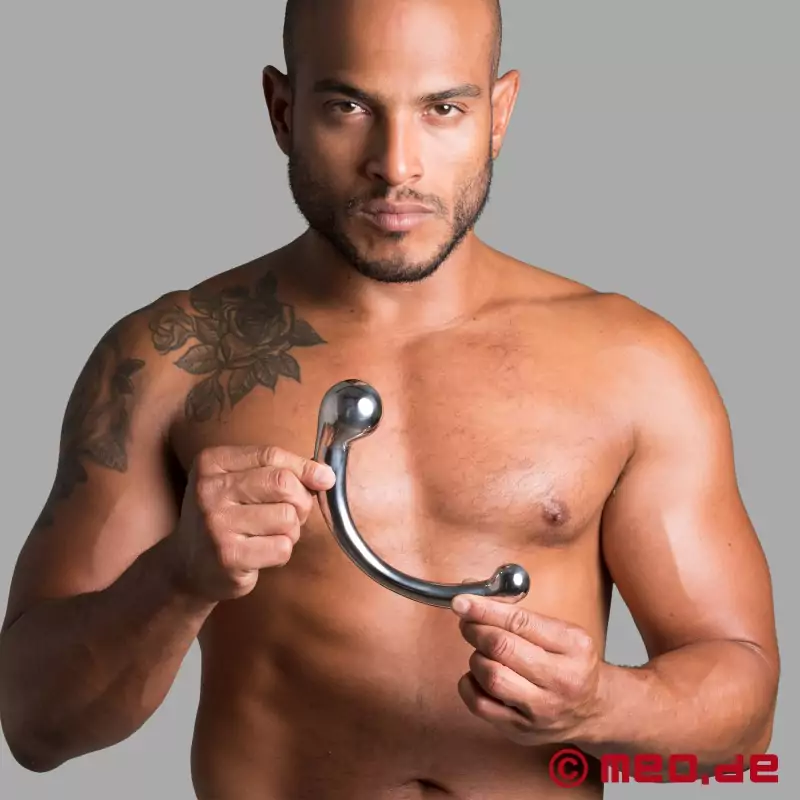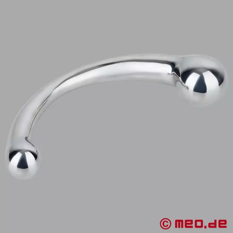 Stainless steel represents power and demands respect. This double ended anal plug features exaggerated curve design with different size bulbous heads. Good to gradually open and relax the anus to milk the P-spot. Steel increases sensitivity and enhances orgasms. Smooth hand polished surface for easy insertion. Can be heated or cooled. Feels heavy and solid.