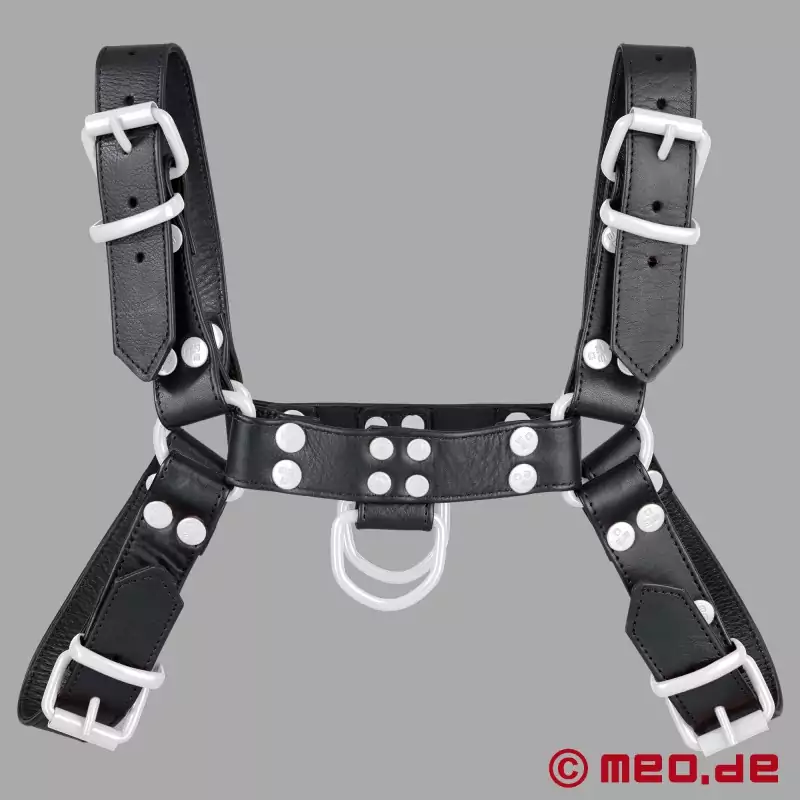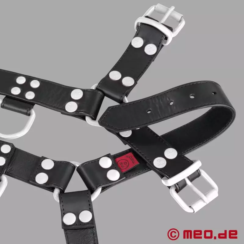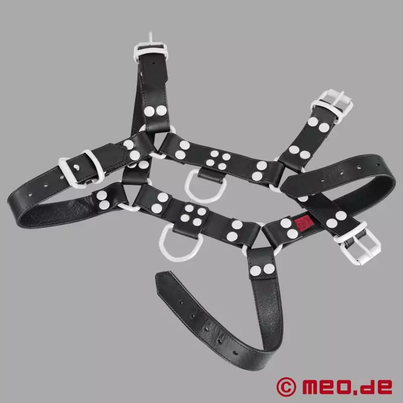 See must-valge nahkrihm MEO® on esimene valik kõigile, kes soovivad oma seksuaalseid eelistusi nähtavalt ja enesekindlalt näidata. FetishGear™ valja-must-valge värvi rakmed teevad oma valgete detailidega selge avalduse - maskuliinne, kompromissitu ja tugevateks etteasteteks loodud.