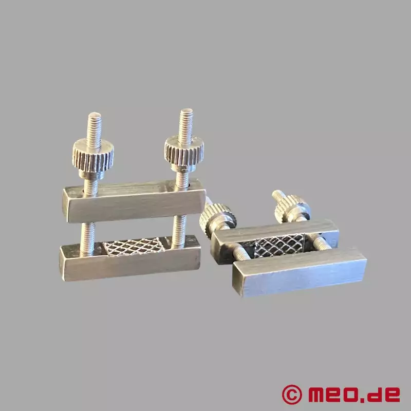 Die Nippelpressen aus Edelstahl sind mit Schrauben ausgestattet, mit denen sich der Druck auf die Nippel kontinuierlich erhöhen lässt. Da die Pressen komplett schließen, kann man die Schmerzwirkung von sanft bis hart variieren. Der schwere, kühle Stahl fühlt sich auf den Nippeln einfach fantastisch an!