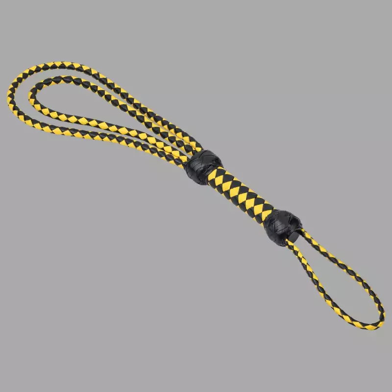 See pilkupüüdev must ja kollane piitsa annab kohe märku sellest, mis partnerit ootab: halastamatu distsipliin ja absoluutne allumine. Klassikaliste rihmade asemel on sellel BDSM-piitsal kaks erineva pikkusega punutud nahast silmust, mis löövad täie täpsusega ja jätavad sügava järelkajuga põletava intensiivsuse.