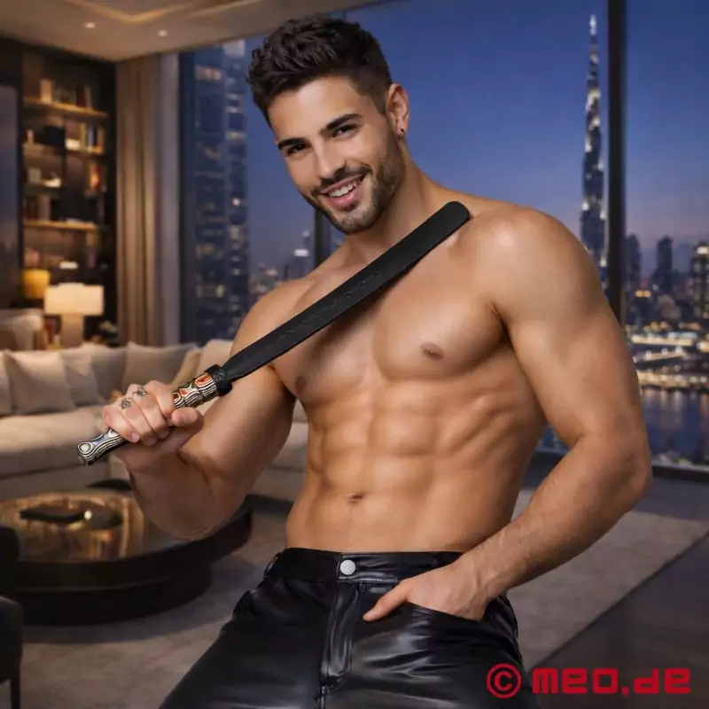 Anatoomiliselt kujundatud puidust käepide sobib ideaalselt kätte ja pakub lisaks visuaalsele ka taktiilset naudingut tänu oma kaunile teravusele. Mahukas dekoratiivne nahksõlm ühendab käepideme nahast BDSM-slapperiga, mis on viimistletud elegantsete horisontaalsete dekoratiivsete õmblustega. Kogupikkusega umbes 59 cm ja kaaluga umbes 300 grammi pakub see Impact Play'i aksessuaar ideaalse tasakaalu kontrolli ja tõhususe vahel, et muuta iga löök unustamatuks.
