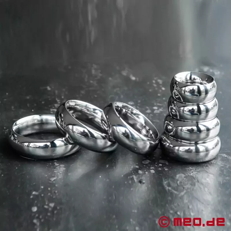 Der Mann wächst mit seinen Aufgaben. Die üppige Geometrie dieses Edelstahl-Cockringe IMPERIAL hatte mich veranlasst, zunächst mit dem größten Durchmesser 55 mm zu beginnen. Das Anlegen dieses Ringes gelang problemfrei. Meine Dame spendete mir Applaus für meinen Auftritt. Aber auch sie meinte, da müsse doch noch mehr gehen. So habe ich jetzt auch die Ringe mit 50 mm und 45 mm Durchmesser erworben. Auch mit dem 50 mm-Ring komme ich bestens zurecht, aber er fasst das Genital schon merklich enger zusammen und presst die Hoden mehr nach vorn. Vom noch nicht erprobten 45 mm-Ring erwarte ich noch mehr Erektionsunterstützung, aber das hat noch Zeit. Das Produktfoto zeigt Mehrfachringe, das sieht total männlich aus und würde mich und sicher auch meine Dame begeistern. Dafür muss ich aber im Alltag noch einige Wochen gewichtige Ballstretcher tragen, die die Länge meines Hodensacks schon jetzt merklich entwickeln.