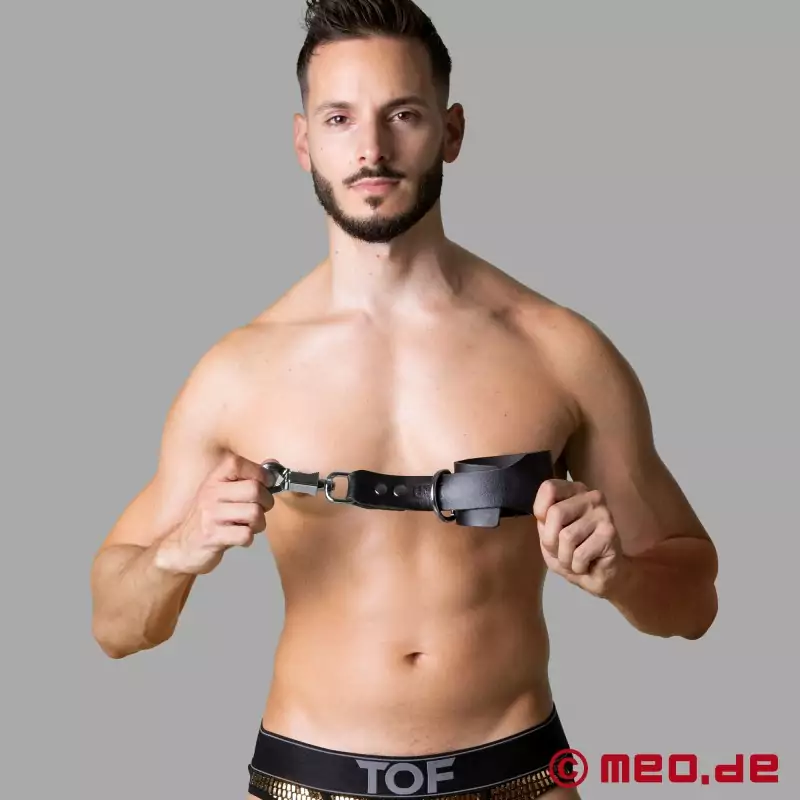 Meie nahast käerauad on nn "Tension Suspension Cuffs". Nende uuenduslik disain tagab, et käeraudad sulguvad automaatselt tihedalt ümber randmete, kui neid pingutada. See mitte ainult ei taga eriti kindlat hoidmist, vaid muudab ka iga sidumisseansi intensiivseks kogemuseks. Niimoodi kinnitatud ja tarnitud olete ihaldusväärne mänguobjekt.