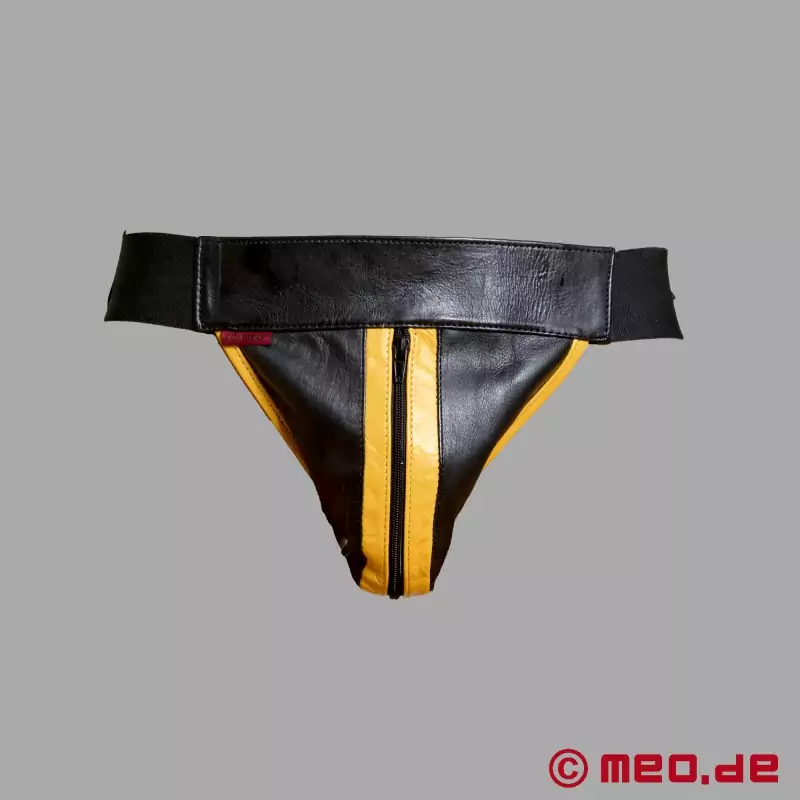 Ekspressiivne! Pehme nahk ja värvivalik. MEO jockstrap on must ja kollane ja see teeb kõigile selgeks, et sa tegeled watersportiga.